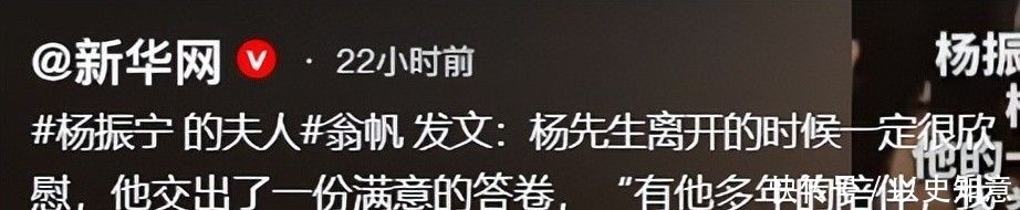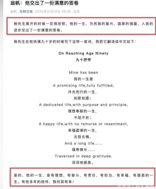 34. 10日,即杨振宁离世次日,翁帆在《光明日报》刊发悼文。文字简短却情深意切,字字戳心。